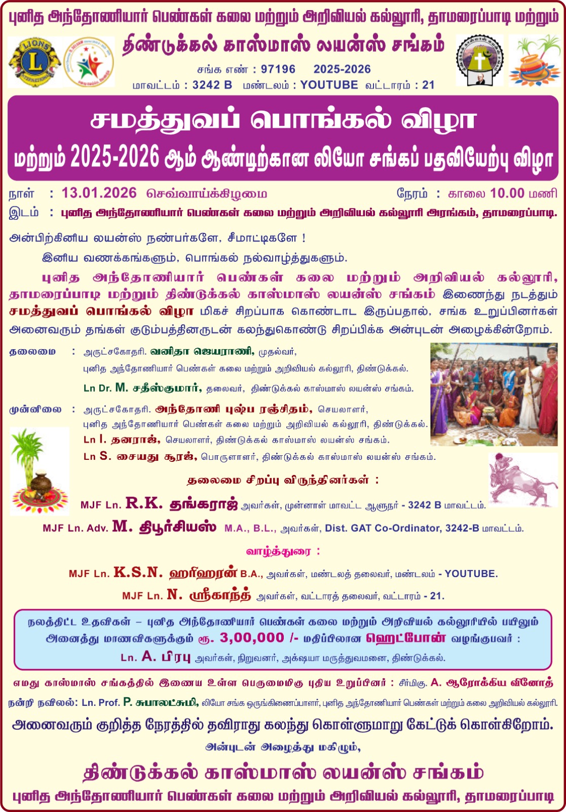 சமத்துவப் பொங்கல் விழா மற்றும் 2025-2026 ஆம் ஆண்டிற்கான லியோ சங்கப் பதவியேற்பு