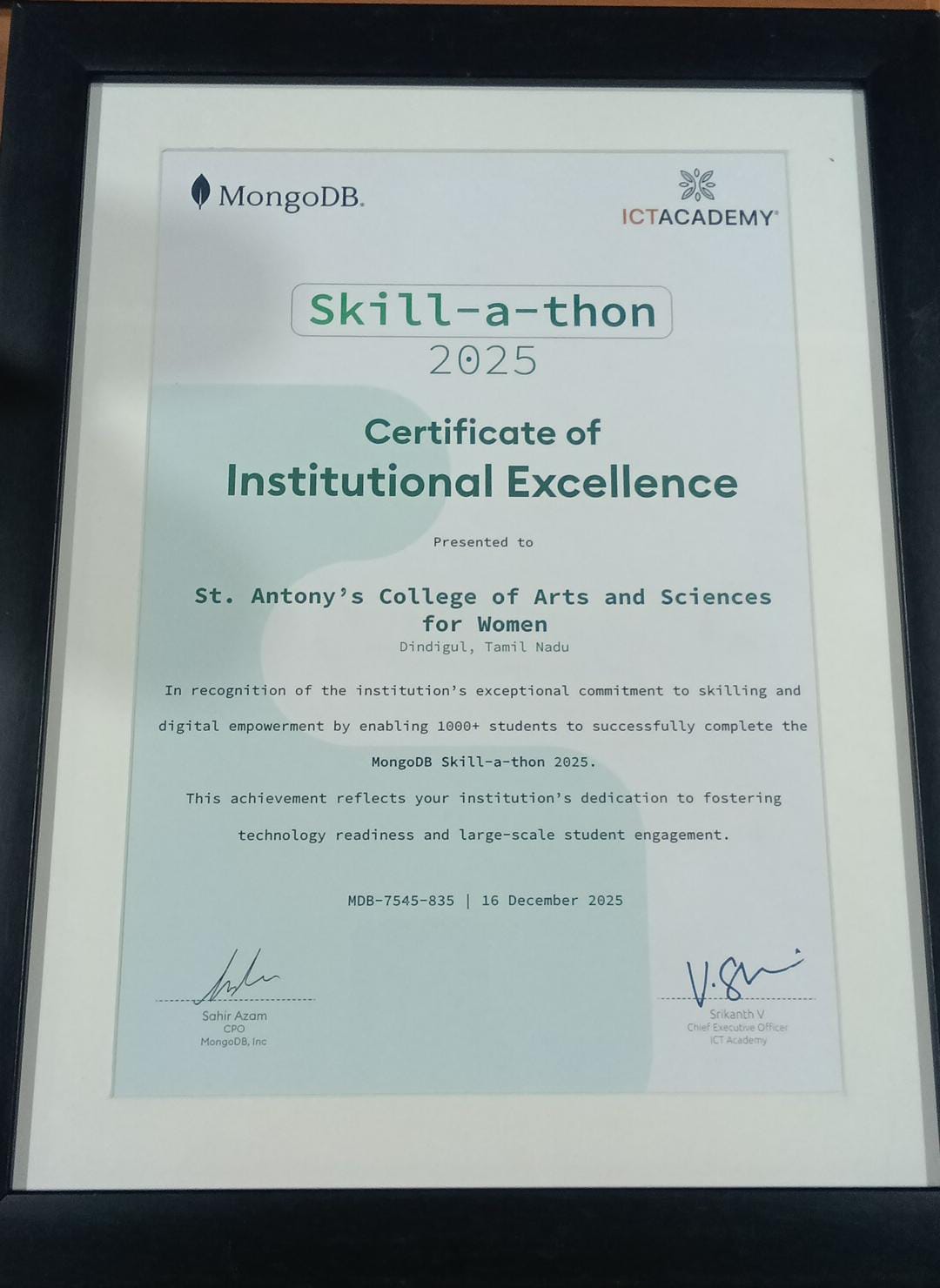 Our institution has been honored with the Award of Institutional Excellence at the MongoDB Academic Summit, Chennai, in recognition of the exemplary completion of the MongoDB Self-Learning Course by o