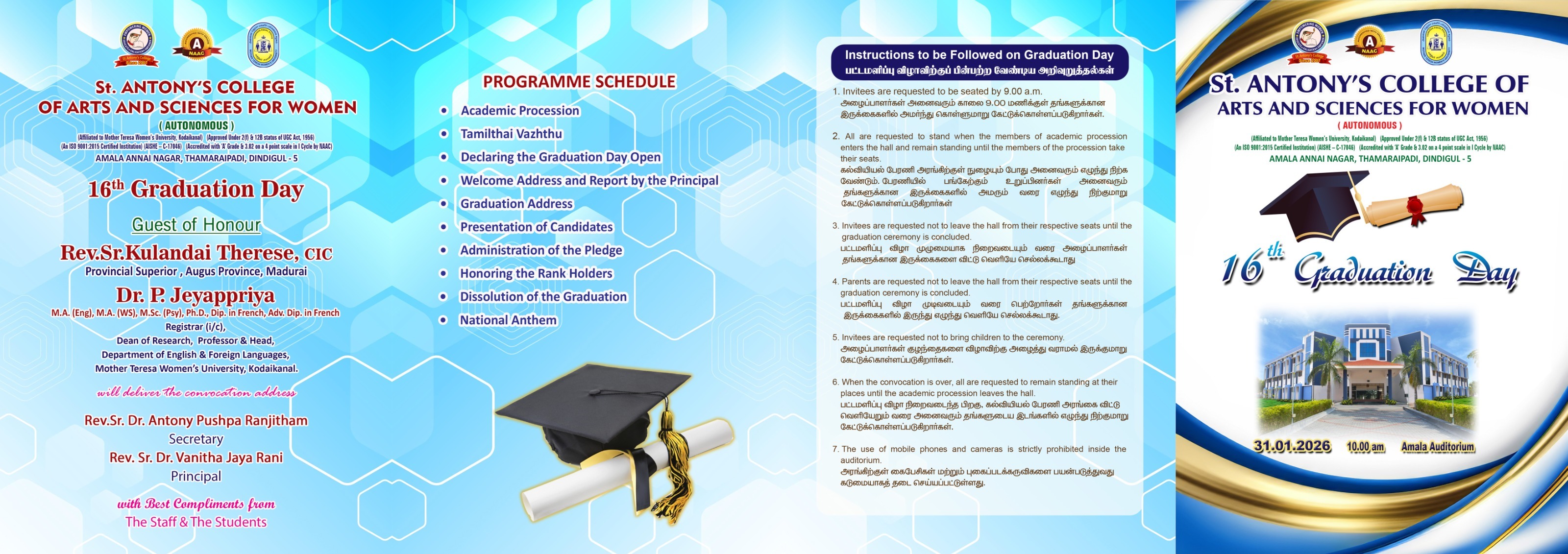Our institution whole heartedly welcomes you all for the 16th Graduation Day. Please read the instructions to be followed on the Graduation Day given in the invitation.